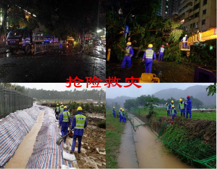 此次抗擊“山竹”,我司共出動(dòng)專家4名,執(zhí)勤人員7名,現(xiàn)場管理人員5名,搶險(xiǎn)人員約120名;出動(dòng)自卸汽車7輛,挖機(jī)7輛,拖車7輛,鏟車4輛,管理車2輛,吊車2輛,皮卡車2輛,28米升降車1輛,工具車1輛;搶險(xiǎn)物資若干。對(duì)于我司在臺(tái)風(fēng)“山竹”搶險(xiǎn)救災(zāi)中的突出表現(xiàn),深圳市及各區(qū)均給予了高度贊揚(yáng),有關(guān)領(lǐng)導(dǎo)親自前往一線對(duì)搶險(xiǎn)人員表示了親切的慰問與關(guān)懷,寶安區(qū)住建局特頒錦旗進(jìn)行了表彰,這都是對(duì)我司在搶險(xiǎn)中突出表現(xiàn)的充分肯定。